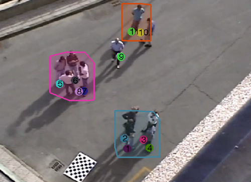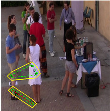 The dataset represents a coffee-break scenario of a social event that lasted 4 days, captured by two cameras. The dataset is part of a social signaling project whose aim is to monitor how social relations evolve over time. Nowadays, only 2 sequences of a single day of a single camera have been annotated (but novel sequences are going to appear, keep in touch!). A psychologist annotated the videos indicating the groups present in the scenes, for a total of 45 frames for Seq1 and 75 frames for Seq2. The annotations have been done by analyzing each frame and a set of questionnaires that the subjects filled in. The dataset is still challenging from the tracking and head pose estimation point of view, due to multiple occlusions. Results of this dataset have been published in the referenced papaer.
